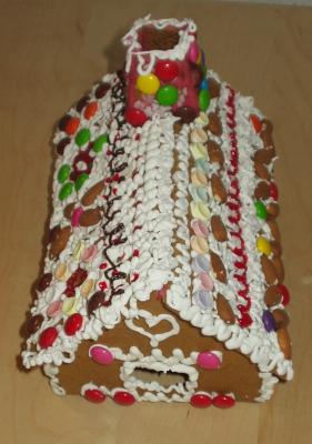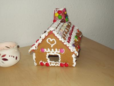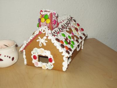 das haus hatte eindeutig zu warm bekommen ( weniger durch die kerze, als eher durch die unsagbare hitze, die in diesem raum wegen den vielen leuten und punschgetränken herrschte) und der lebkuchen war total aufgeweicht, sodass das häuschen in sich zusammengefallen ist.